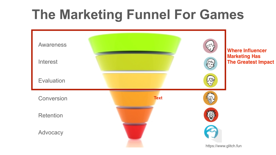 In our marketing guide, we discussed the marketing funnel and how a potential player moves through it, ultimately deciding to buy or install your game. Influencer marketing primarily impacts the top of the funnel by raising awareness about the game, but it also influences the interest and, especially, the evaluation stages of the buying process.